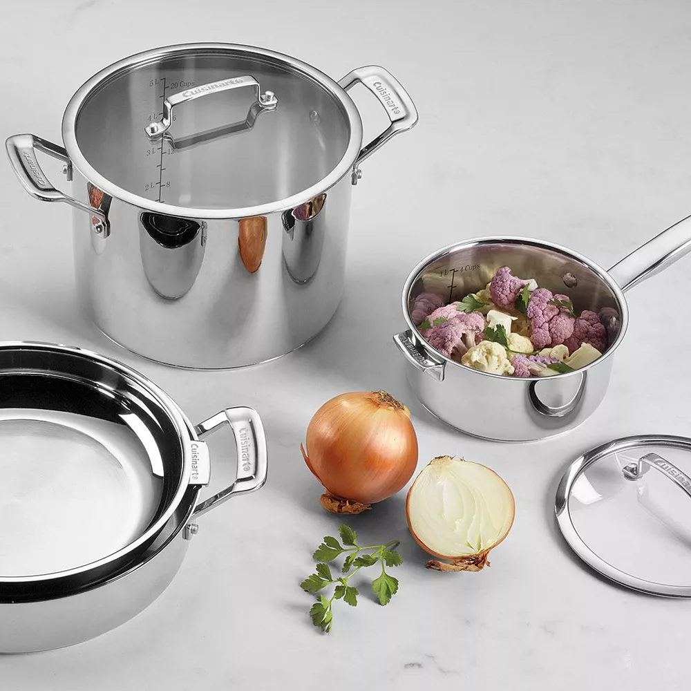 This 11-piece nesting cookware set from Cuisinart is a uniquely designed, advanced cookware system that reduces the space needed to conveniently access and safely store pots and pans. Vessels effortlessly nest together with secure tabs to keep you and your cabinet organized!